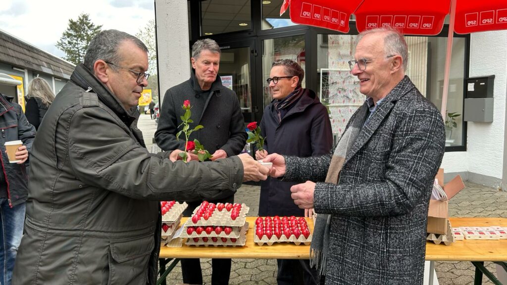 Auch von vorhergesagtem Regen ließen sich die Gülser Sozialdemokrat*innen nicht abhalten, eine schöne Tradition fortzuführen: am Samstag vor dem Osterwochenende beschenkten die Genoss*innen alle, die es annehmen mochten mit roten Rosen, Ostereiern und allerlei Nützlichem wie Kugelschreiber, Flaschenöffner und Einkaufswagen-Chips. Einige Bürger*innen nutzten die Gelegenheit mit den Kandidat*innen für die anstehende Kommunalwahl ins Gespräch zu kommen, viele freuten sich aber auch einfach über die kleinen Geschenke, mit denen der Ortsverein ganz unabhängig von Wahlen ein schönes Wochenende und eine gute Osterzeit wünscht.