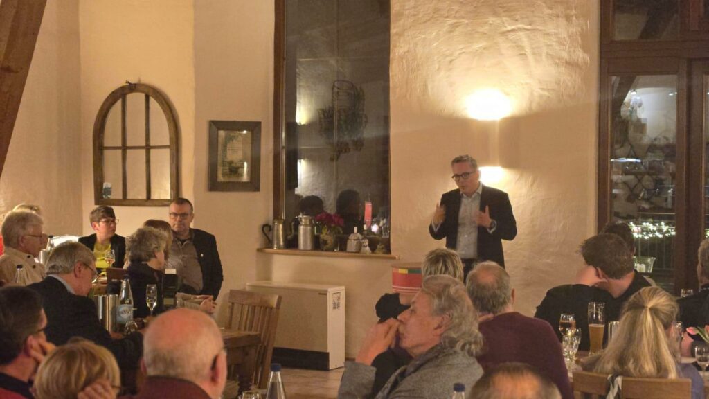 Zunächst ging Toni Bündgen in seinem Grußwort jedoch darauf ein, dass der aktuelle Gegenwind, der den etablierten Parteien der Mitte ins Gesicht bläst, teils berechtigt, teils jedoch auch reiner Populismus sei und der Trend, immer neue Kleinparteien wie Volt und BSW und Werteunion zu gründen, einerseits demokratisch legitimiert ist, andererseits aber auch kritisch betrachtet das Regieren mit immer weniger Stimmenanteil und mehr Koalitionspartnern verkompliziert.